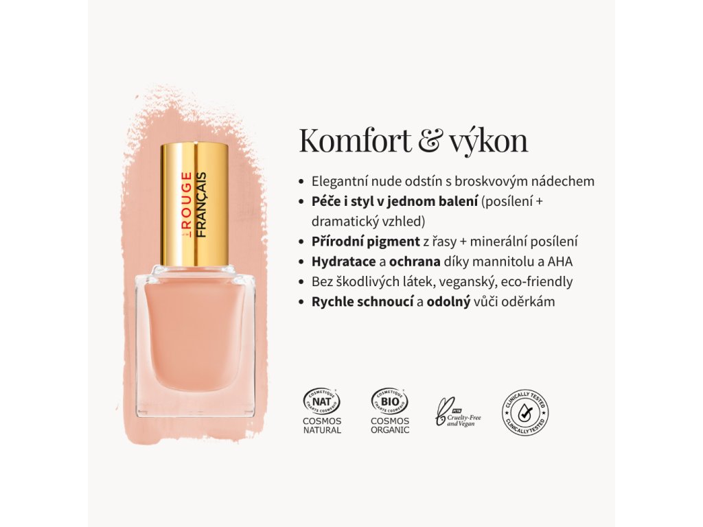 Nehty budou elegantně zbarvené, hladké a s dlouhotrvajícím leskem. Pravidelné používání podpoří jejich zdraví, sílu a odolnost proti lámání.
