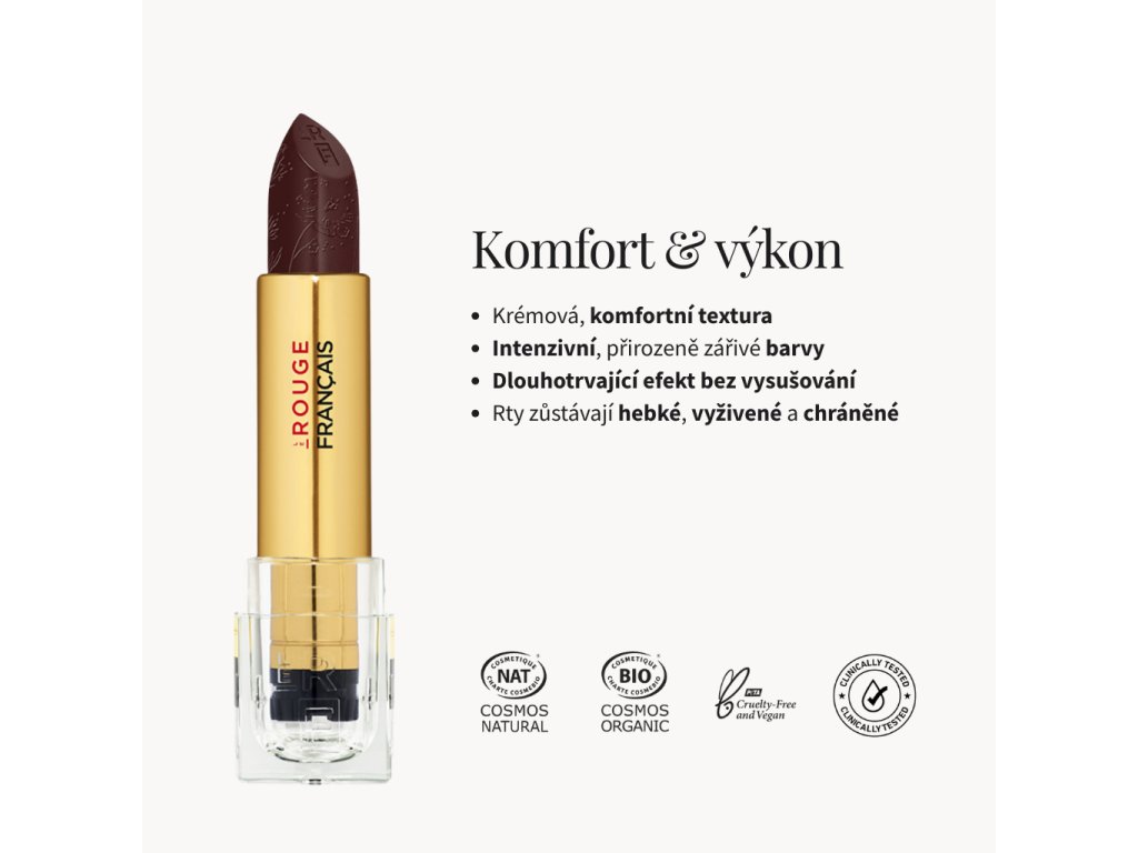Rty budou plné výrazné barvy, hebké a vyživené, bez pocitu pnutí či vysušení. Rtěnka podtrhne váš osobitý styl a zvýrazní přirozenou krásu.