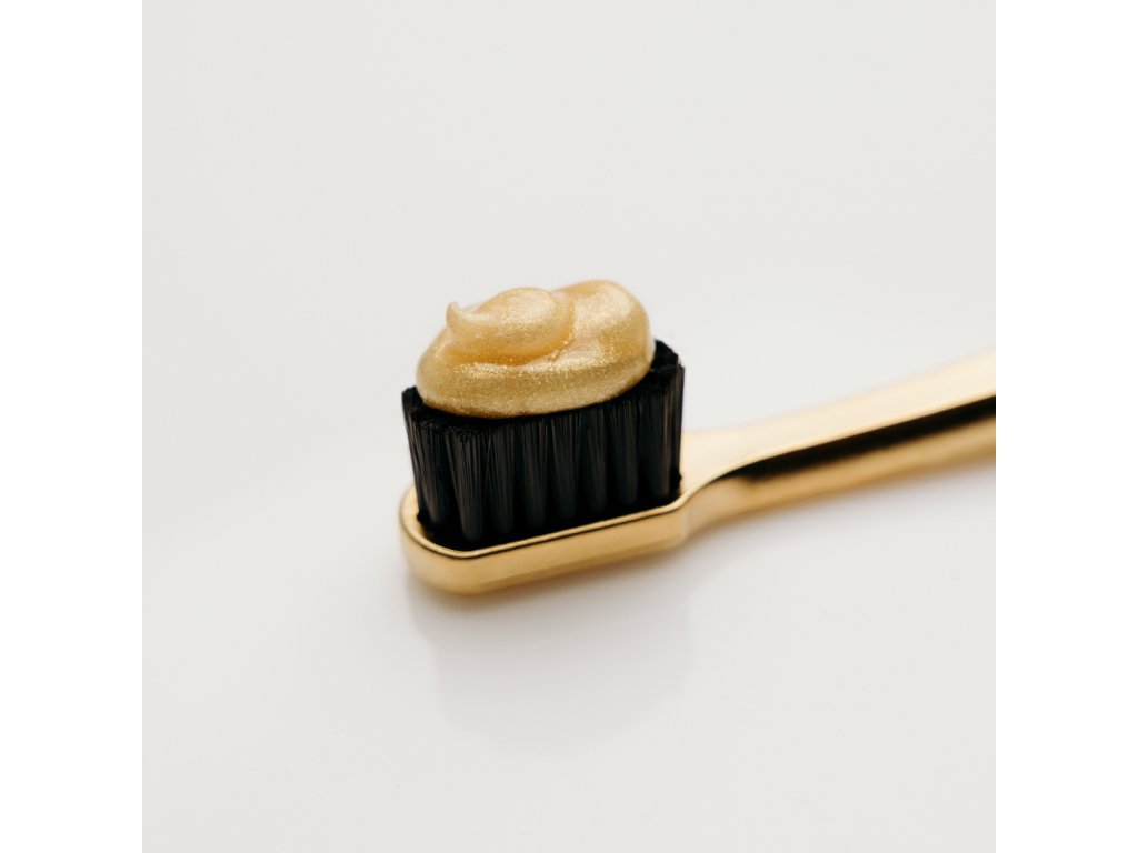 Zubní pasta s hydroxyapatitem a 24K zlatem jemně čistí a pomáhá bělit zuby bez použití fluoridu, zatímco extra jemný kartáček se 24K zlatým držadlem šetrně pečuje o zubní sklovinu i dásně.