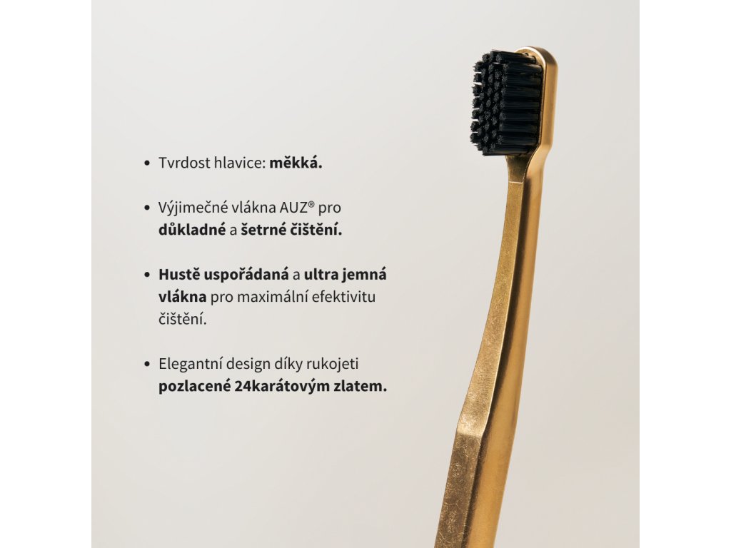- Zubní kartáček s pozlacenou rukojetí a bílou hlavicí měkké tvrdosti