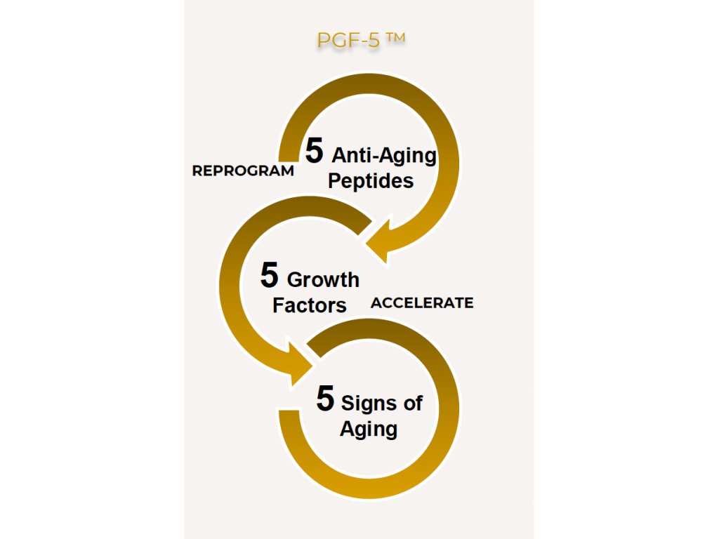 PGF-5™ je inovativní peptidový komplex navržený k cílenému boji proti všem hlavním známkám stárnutí pleti. Tvoří ho pět biomimetických peptidů, které stimulují buněčnou obnovu, podporují syntézu kolagenu a elastinu, posilují strukturu pokožky, viditelně vyhlazují vrásky a jemné linky, zpevňují kontury a obnovují jas pleti.