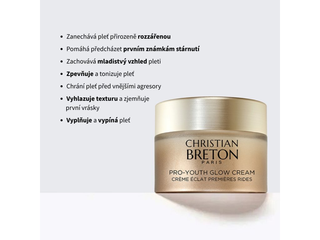 Lehký rozjasňující krém Pro-Youth Glow Cream od Christian Breton je luxusní pleťový krém navržený pro obnovu mladistvého vzhledu, intenzivní hydrataci a ochranu před známkami stárnutí. Spojuje sílu vitamínů, rostlinných olejů a mořských výtažků pro maximální efektivitu a komfort při každodenním používání.