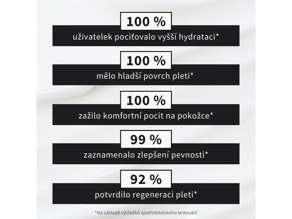Při pravidelném používání bude pleť intenzivně hydratovaná, jemnější a viditelně hladší, s redukovanými jemnými linkami a sjednoceným tónem. Spotřebitelské testy potvrdily: 100 % uživatelek pociťovalo vyšší hydrataci, 100 % mělo hladší povrch pleti, 100 % zažilo komfortní pocit na pokožce, 99 % zaznamenalo zlepšení pevnosti a 92 % potvrdilo regeneraci pleti.