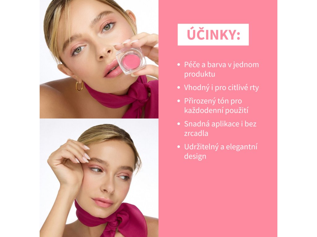 Tónovaný balzám můžete nanést prstem pro přirozený vzhled, nebo štětečkem na rty pro přesnější aplikaci. Naberte malé množství a naneste přímo na rty, postupujte od středu směrem ke koutkům. Jemně rty přitiskněte nebo poklepejte, aby se barva lépe usadila. Jeho flexibilní krytí se přizpůsobí vašemu stylu a preferencím. Jediným tahem dosáhnete jemného tónu s efektem „lehce kousnutých rtů“. Pro intenzivnější výsledek vrstvěte podle potřeby, dokud nedosáhnete požadovaného efektu.