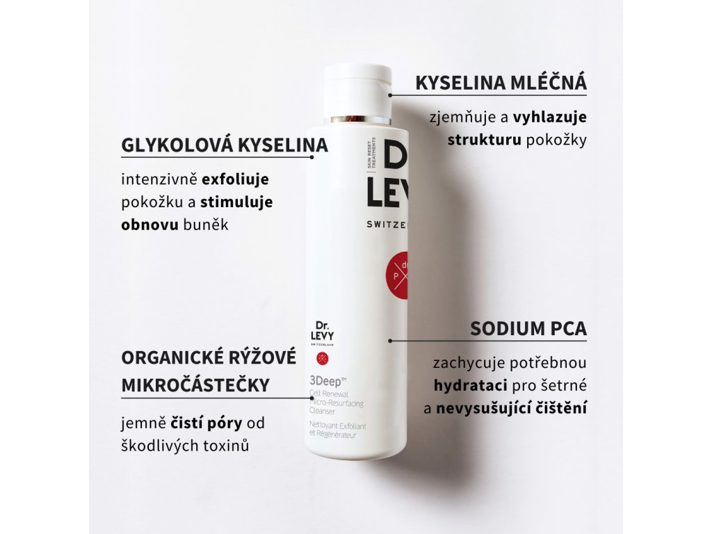 Dr. LEVY 3Deep Micro-Resurfacing Cleanser je inteligentní hybridní produkt, který spojuje sílu čisticí pěny a exfoliační masky. S jemnými AHA kyselinami, enzymy z papáji a mikročásticemi poskytuje účinné, ale šetrné čištění pro viditelně jasnější a hladší pleť.