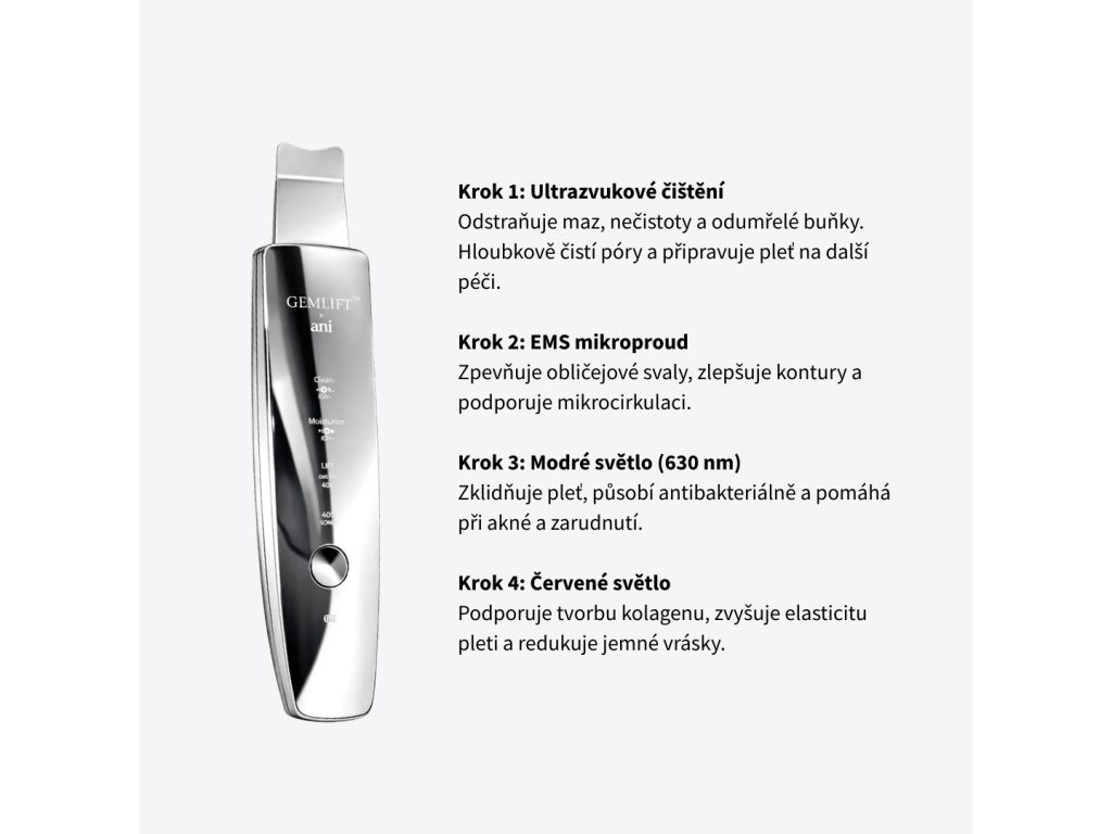 Ultrazvuková špachtle 4v1 od GemLift x Ani přináší do vaší domácí rutiny profesionální technologii pro dokonale čistou, pevnou a mladistvou pleť. Kombinuje čtyři pokročilé režimy – ultrazvukové čištění, EMS mikroproud, iontovou technologii a světelnou terapii – pro intenzivní péči a viditelné výsledky už po prvních použitích.