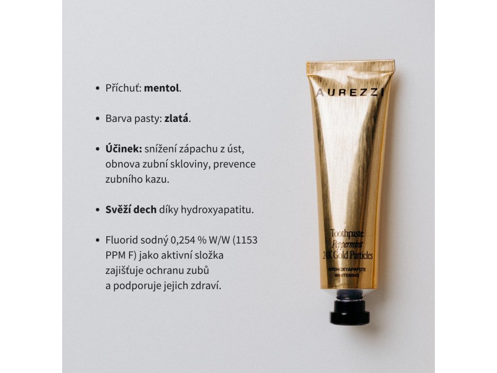 - Bělící zubní pasta - bez fluoridu, částice 24karátového zlata, hydroxyapatit, bělící účinek