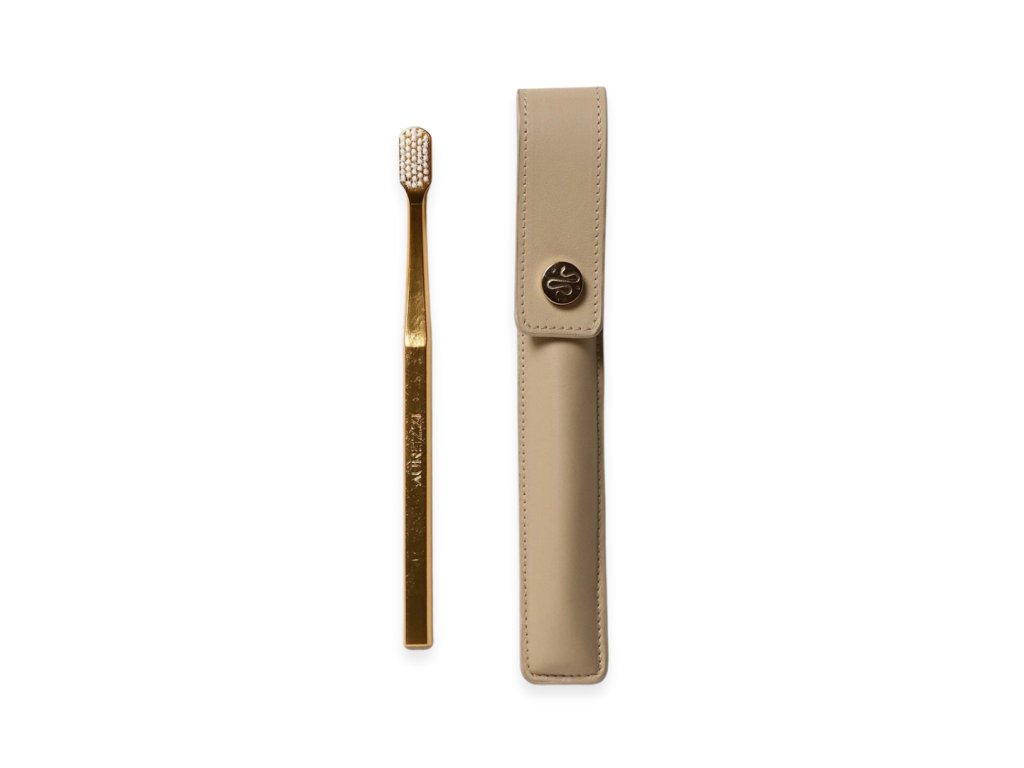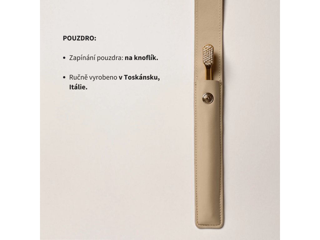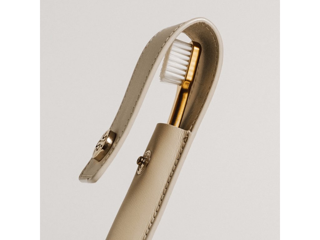 Zlatý kartáček s bílou hlavicí a béžovým koženým pouzdrem Leather Case Button/Beige & Toothbrush - Soft