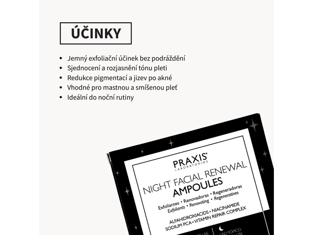 Glykolová a mléčná kyselina (Night Facial Renewal) – exfoliace a sjednocení tónu