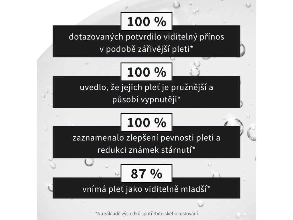 Pleť je na pohled mladší, zářivější a pevnější. Vrásky jsou viditelně redukovány, textura pokožky vylepšena a celkový vzhled pleti revitalizovaný. Podle zpětné vazby uživatelek je liftingový efekt patrný již po prvním použití a pocit hebkosti a hydratace přetrvává celý den. 100 % uživatelek zaznamenalo zvýšený jas pleti, 95 % pocítilo pevnější a pružnější pokožku a 90 % uvedlo zlepšení pevnosti i viditelné snížení známek stárnutí. 80 % hodnotilo svou pleť jako viditelně mladší a 95 % potvrdilo, že pleť vypadá vypnutější.