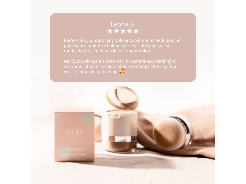 Bronzer dodá pleti teplý tón a zvýrazní kontury, zatímco rozjasňovač přináší perleťový odlesk a rozjasnění tam, kde je potřeba. Výživné oleje pokožku hydratují a chrání před předčasným stárnutím.