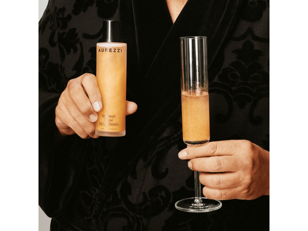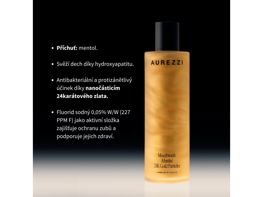 Ústní voda proti zápachu z úst, která vám zanechá pocit svěžesti a luxusu. Její formule obsahující 24karátové zlaté částice působí proti bakteriím a podporuje remineralizaci zubů, čímž předchází vzniku zubního kazu a snižuje citlivost zubů. Je jemná a osvěžující, s mátovou příchutí, která udrží váš dech svěží po celý den.