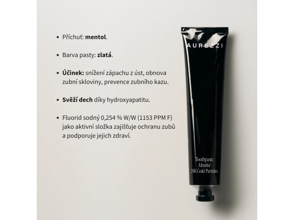 Dopřejte svému úsměvu luxusní péči s unikátní kolekcí zubních past od AUREZZI, které obsahují nanočástice 24karátového zlata. Je to skvělá volba pro ty, kteří chtějí proměnit každodenní rutinu čištění zubů v luxusní rituál. Tato mentolová zubní pasta s hydroxyapatitem pomáhá zbavit se zápachu z úst, obnovovat zubní sklovinu a předcházet vzniku zubního kazu.
