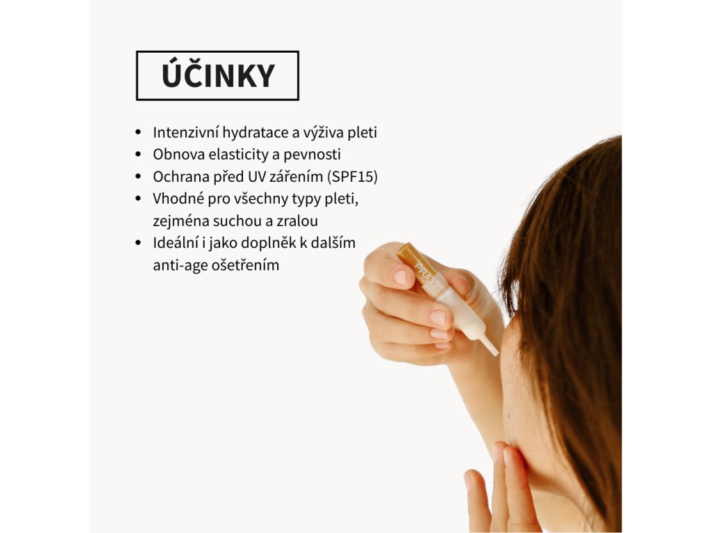 - Hydratační ampule: 3% proteoglykany, vitaminy C, E a F, SPF 15