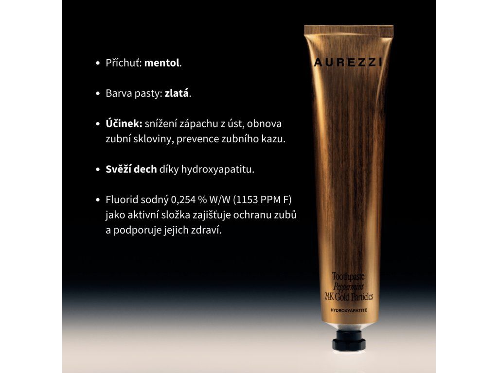 - Zubní pastu s příchutí mentolu a nanočásticemi 24karátového zlata