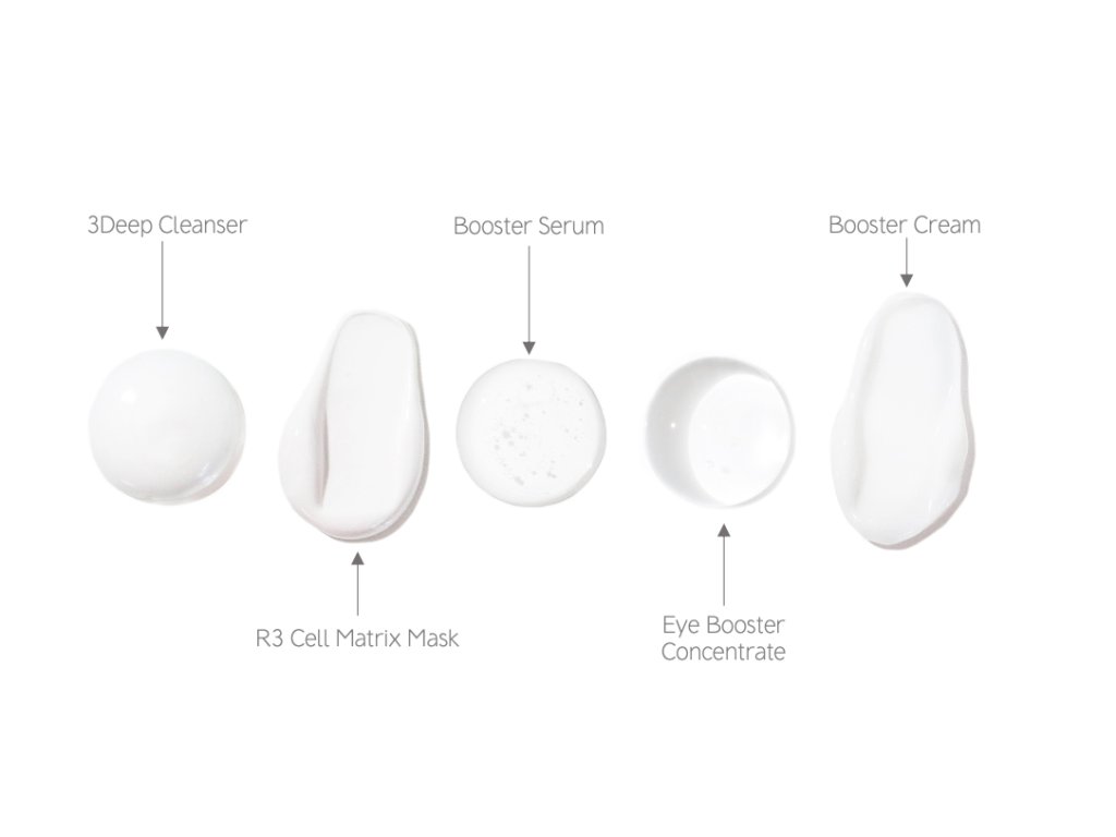 - Obsah balení: 3Deep Cleanser (20 ml), R3 Cell Matrix Mask (50 ml), Booster Serum (30 ml), Eye Booster Concentrate (15 ml), Booster Cream (50 ml)